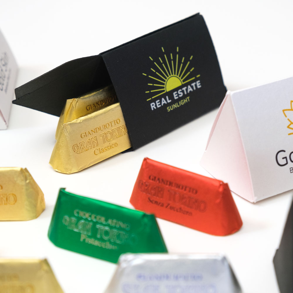 Le scatole possono contenere 2 o 3 gianduiotti. Possibilità di personalizzare l’incarto con il tuo logo.